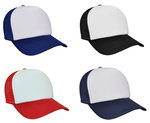 Standard fit, 5-panel trucker cap with poly padded front and mesh back. Pre-curved peak, adjustable plastic strap.