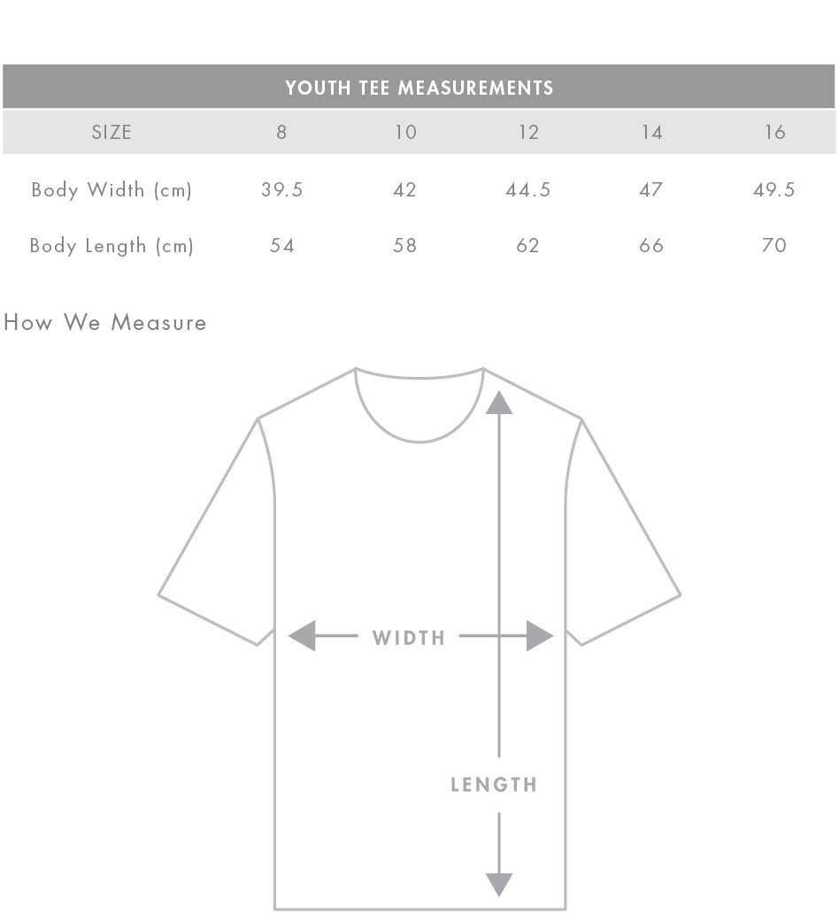 FIT: Regular fit - please check the size chart to avoid disappointment. Lay your own tee flat on a table, measure armpit to armpit across the chest and match to the size you feel is best. Please note measurements can vary within 2.5cm, this is within the accepted tolerance.